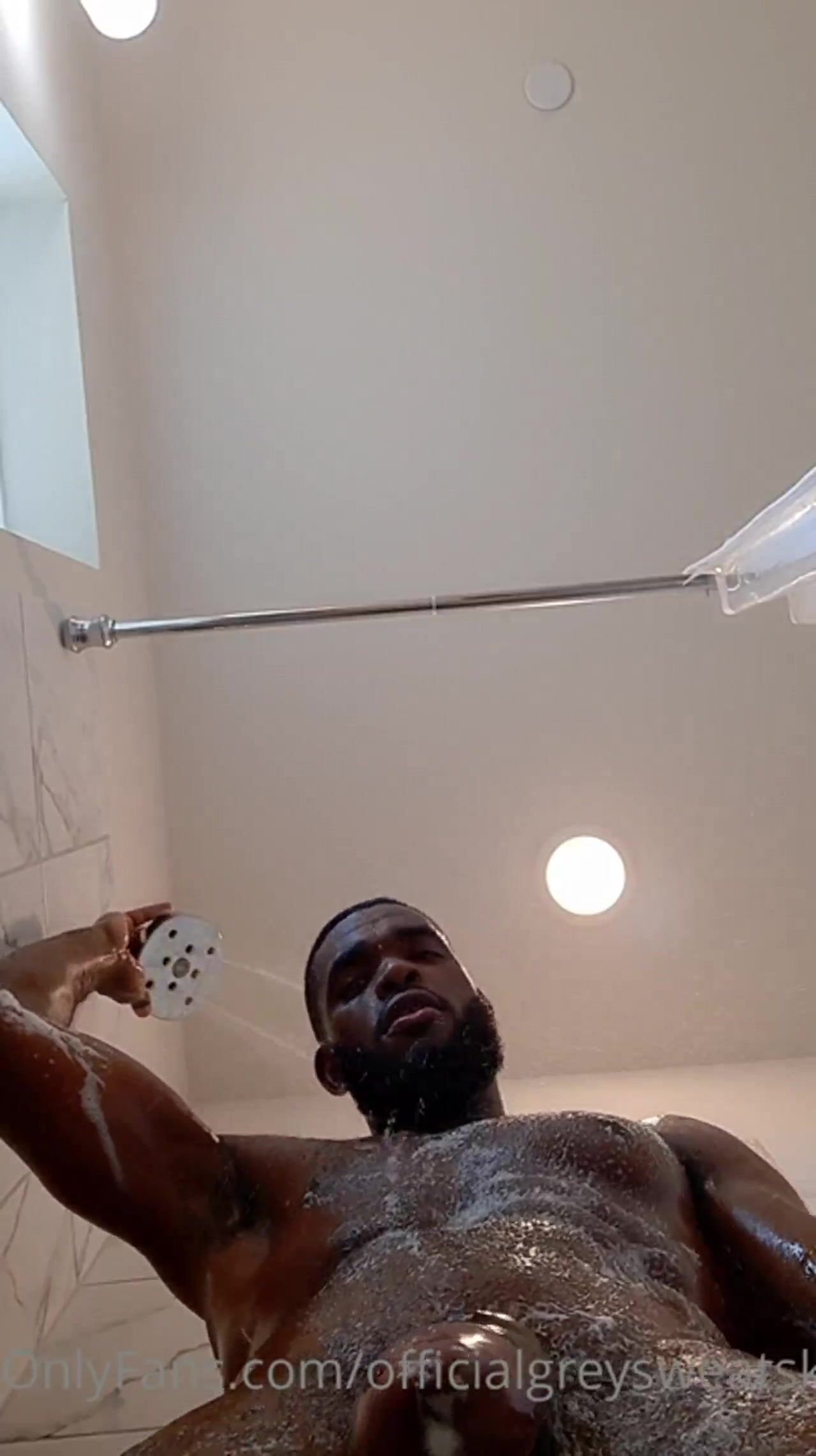 Young black stud jerks long pole and cums hard