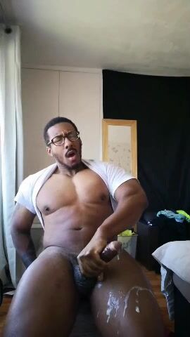 Big black muscular bull stroking his huge uncut cock