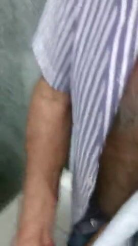 Handsome hung rubbing his cock in a public bathroom